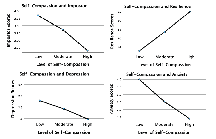 MANOVA was utilized to determine whether the level of self-compassion (categorized as low, moderate, or high) was related to the level of IP, resilience, anxiety, and depression (Neff, 2003). Self-compassion had a significant positive relationship with mental health and resilience; however, the relationships varied significantly based on level of self-compassion (Figure 4). The results demonstrate that even lower levels of self-compassion were related to significantly lower IP, anxiety, and depression, as well as increased resilience. This pattern suggests that even modest improvements in self-compassion can correspond to improved well-being among developing counselors (Luo et al., 2023). For example, IP severity decreased significantly as self-compassion levels increased, revealing a linear reduction in IP from low to high self-compassion levels, with the most pronounced decrease occurring between the moderate and high categories.